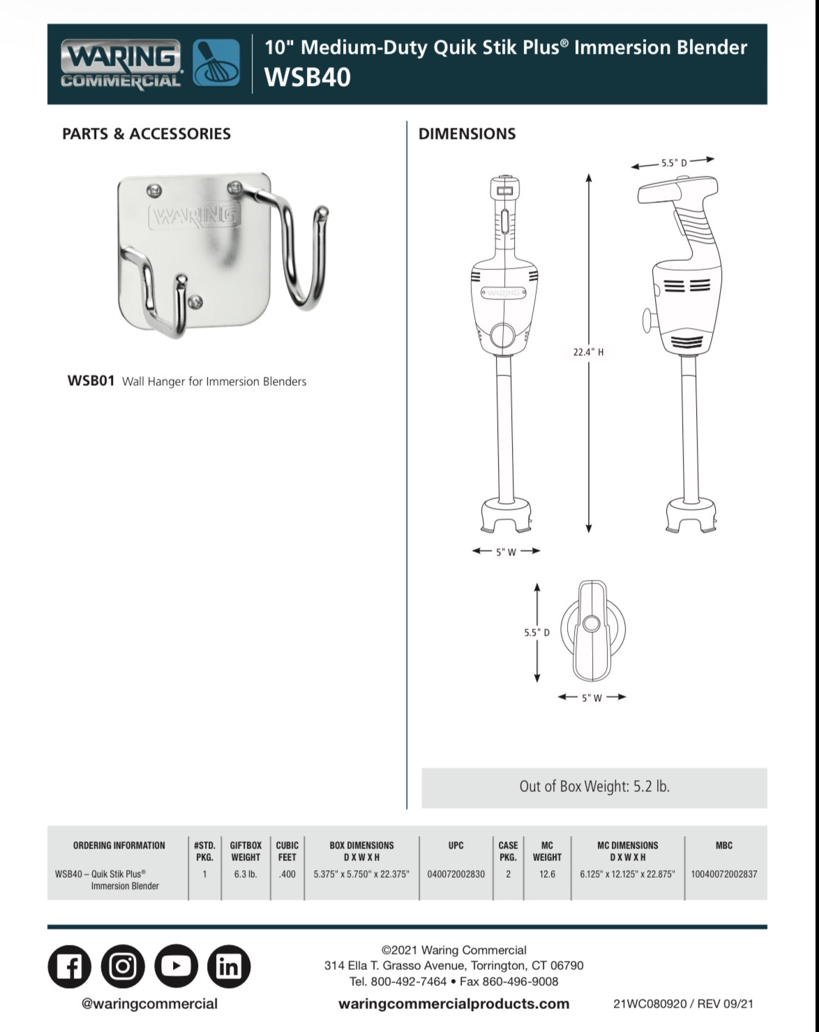 Waring WSB40 Quik Stik Immersion Blender 10" Two-Speed 1/2 HP