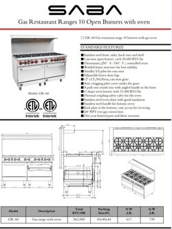 Saba 10 Burner Range Stove with Standard Oven GR-60 NO TARIFF FEES ■ Stainless steel front, sides, back and shelf ■ 60" W x 33" D x 60" T ■ Octagon cast iron burners 30,000 BTU/hr. each ■ 12" x12"(30x30cm) cast iron grate ■ Adjustable heavy duty legs ■ Anti-clogging pilot cover ■ Pull out crumb tray at the bottom ■ Oven thermostat adjusts from 250°F to 550°F ■ Two oven racks included, four rack positions ■ Optional with castors ■ U shape oven burner 31,000 BTU/hr. each ■ NG/LP Conversion Kit Included ■ 3⁄4" NPT rear gas connection ■ Gas regulator included ■ One year limited parts and labor warranty $3,499.99 In Stock *NEW IN ORIGINAL MANUFACTURER PACKAGING. MANUFACTURER WARRANTY INCLUDED. IN STOCK AND AVAILABLE FOR IMMEDIATE DELIVERY IN ILLINOIS FOR AN EXTRA FEE.www.GPRestaurantEquipment.com #10burner #restaurantrange #Commercialrestaurantstove #tenburner #doubleoven #restaurantequipment #foodservice